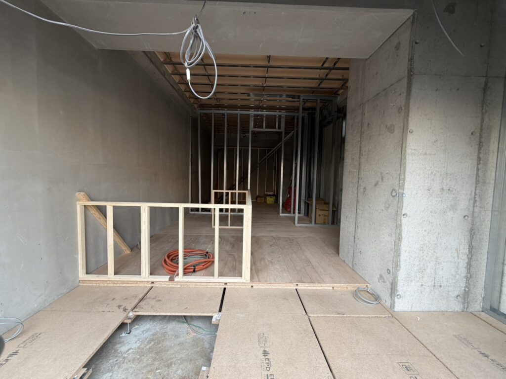 電気配線の仕込みが完了し間仕切り壁の下地の施工も順調にすすんできました。